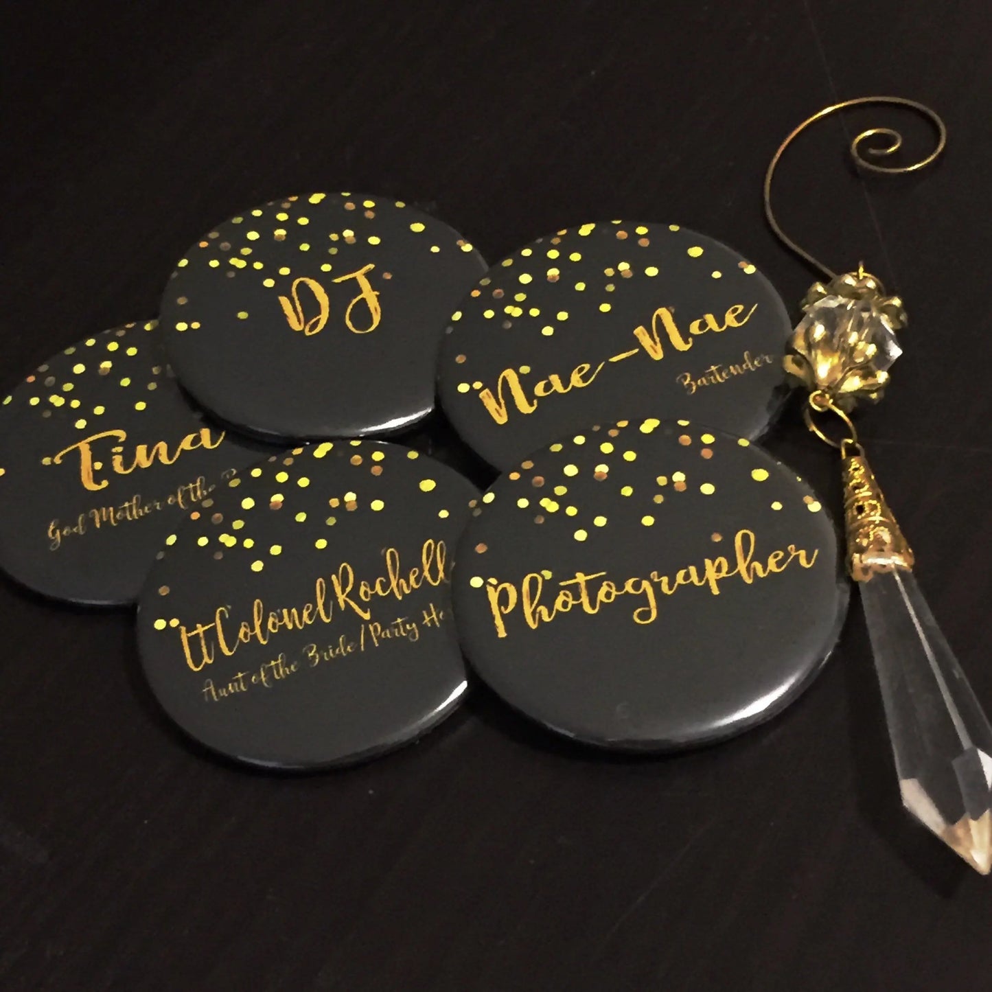 Button size 2.25 x 2.25 inches with pin, keychain, magnet or mirror will make a perfect momento for the Bride, Groom, Wedding Entourage or even as gift for the guests.