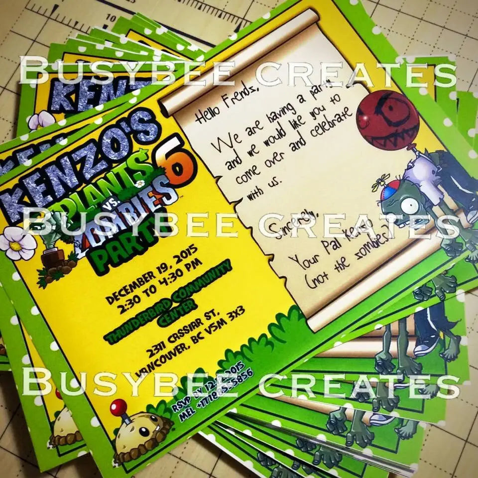Planning a fun Plant vs Zombies party? This listing is for 4x6 invites with envelope. Note:Envelope color may vary depending on availability. White ones will be the default color sent. If you want a different size or layout/theme. We can also do that for you too but prices may vary for different size :)